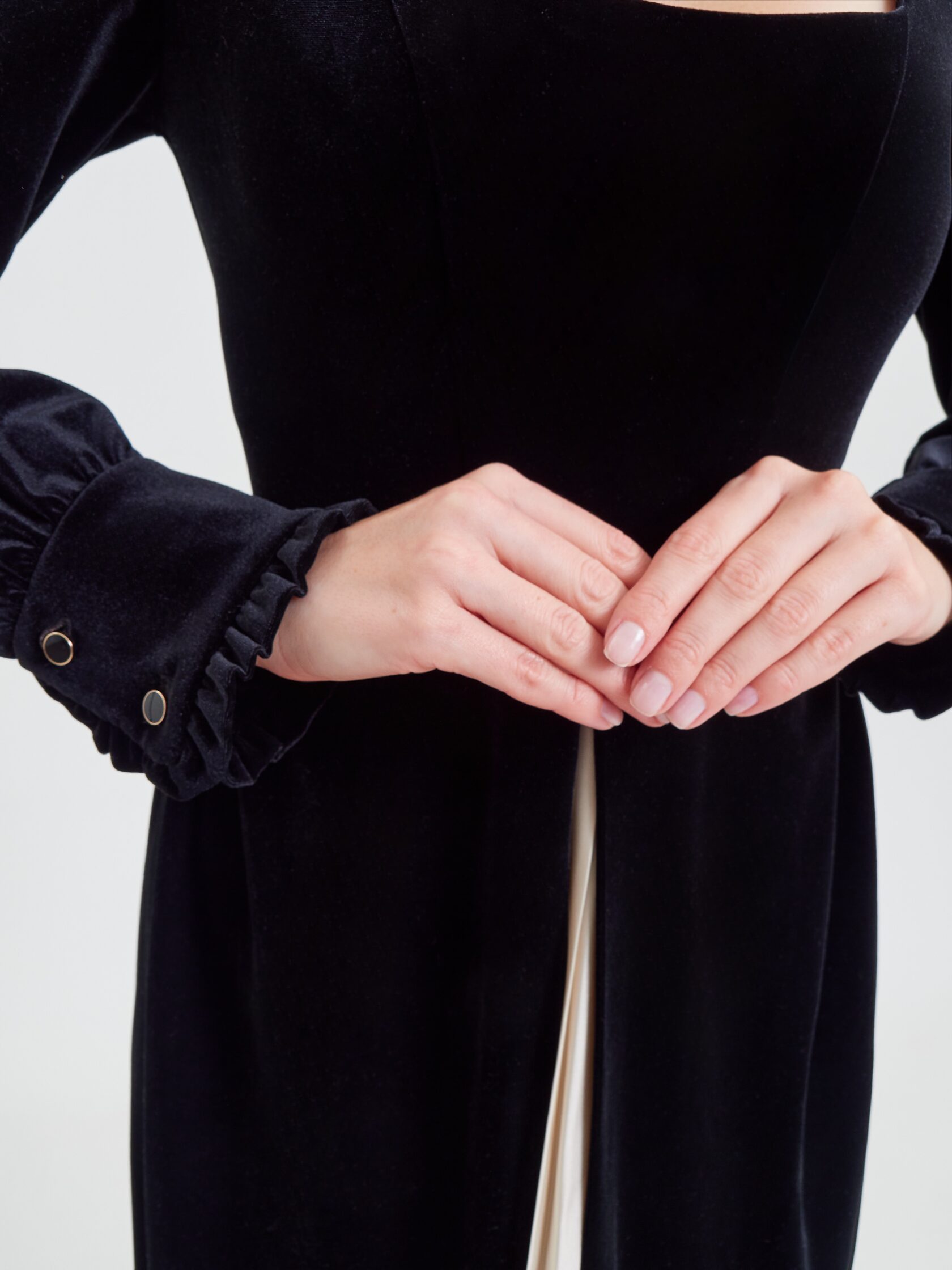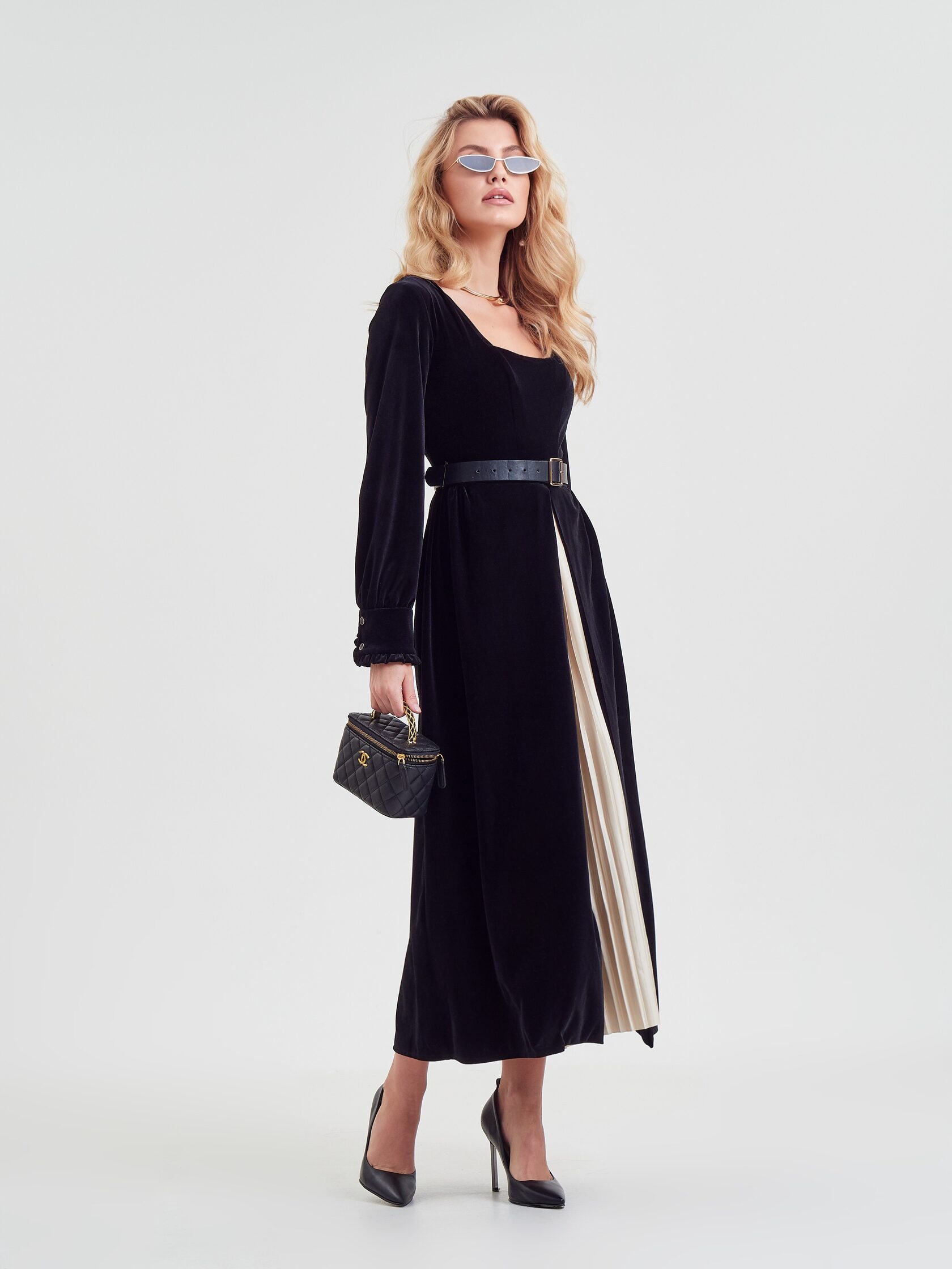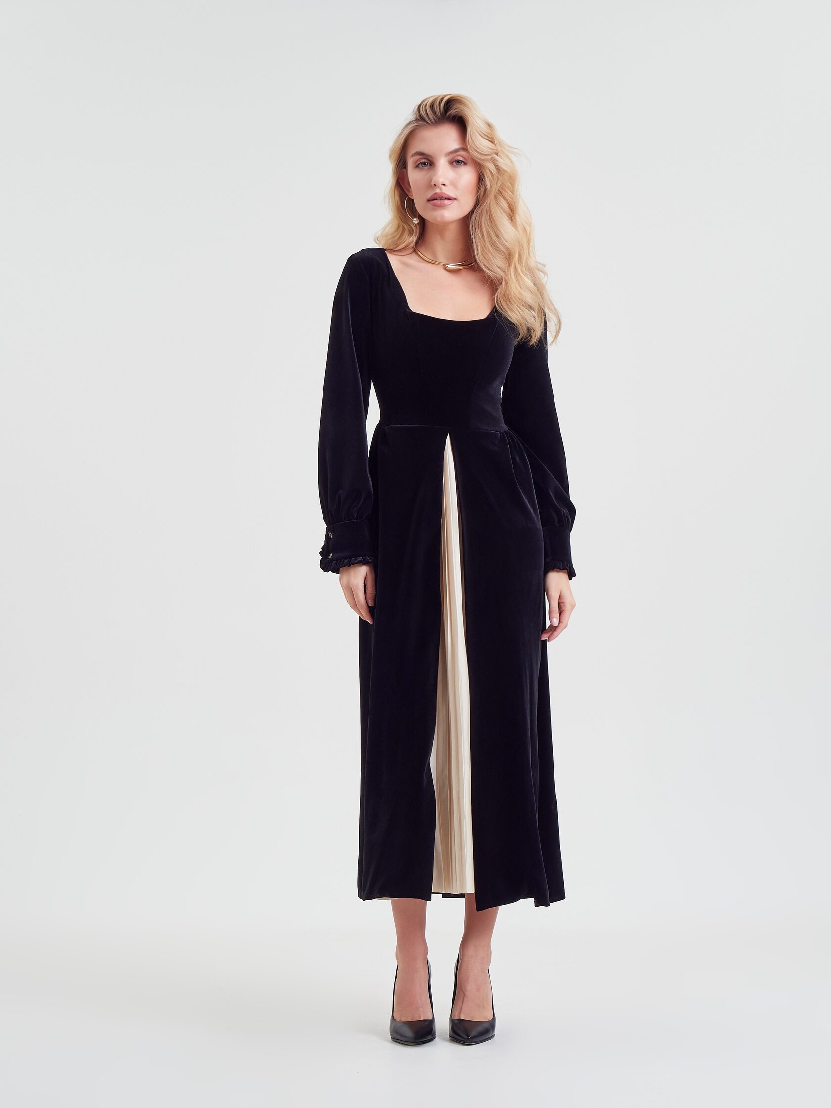 Черный бархат задает тон всему образу. Он одновременно строгий и с легкой игривостью в виде деликатного блеска. Вставка плиссе из искусственного шелка цвета айвори оживает вместе с движениями обладательницы изделия.
