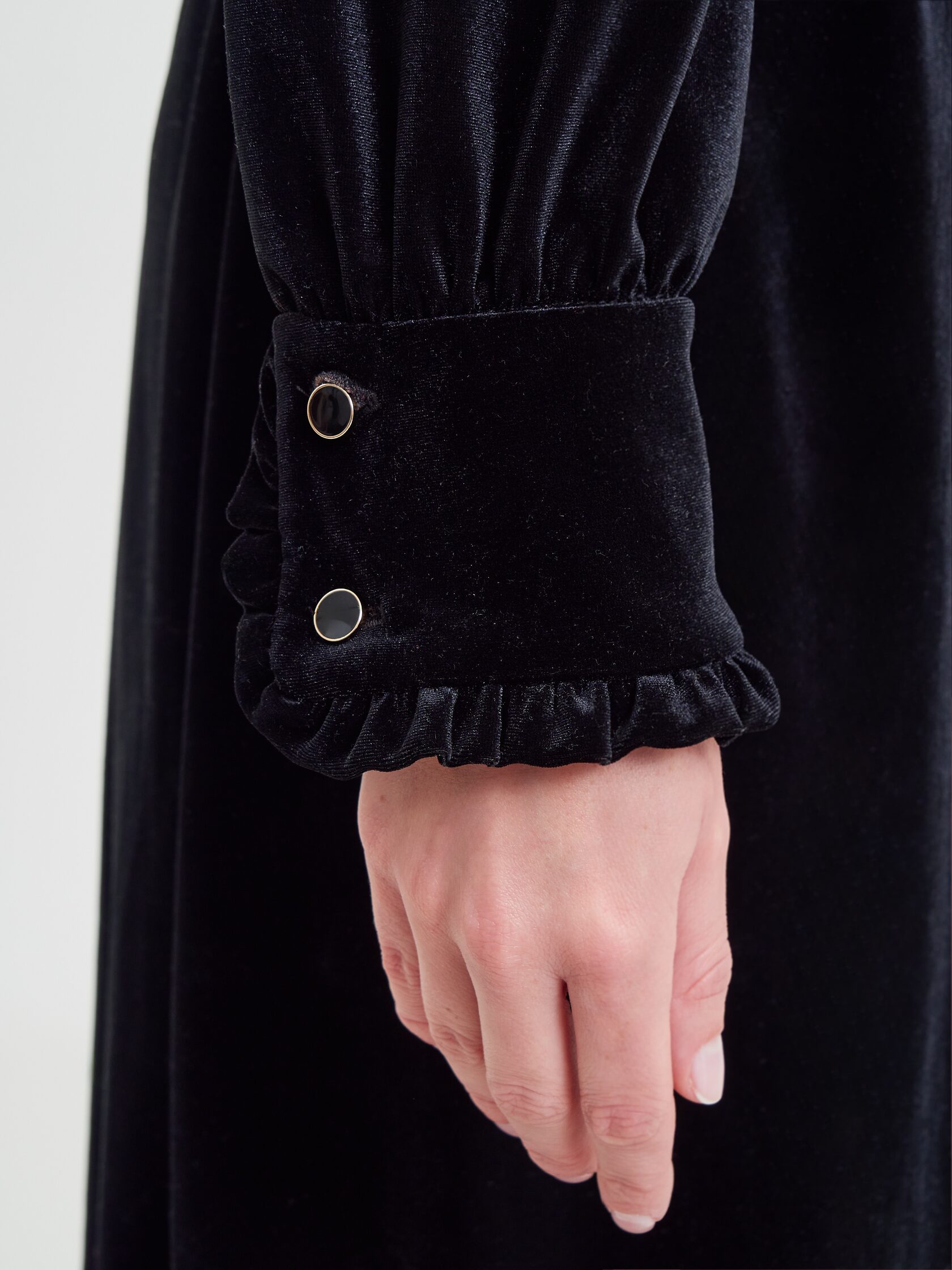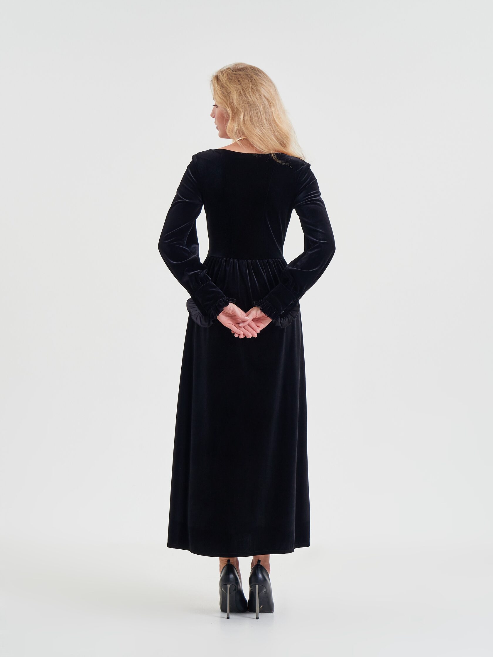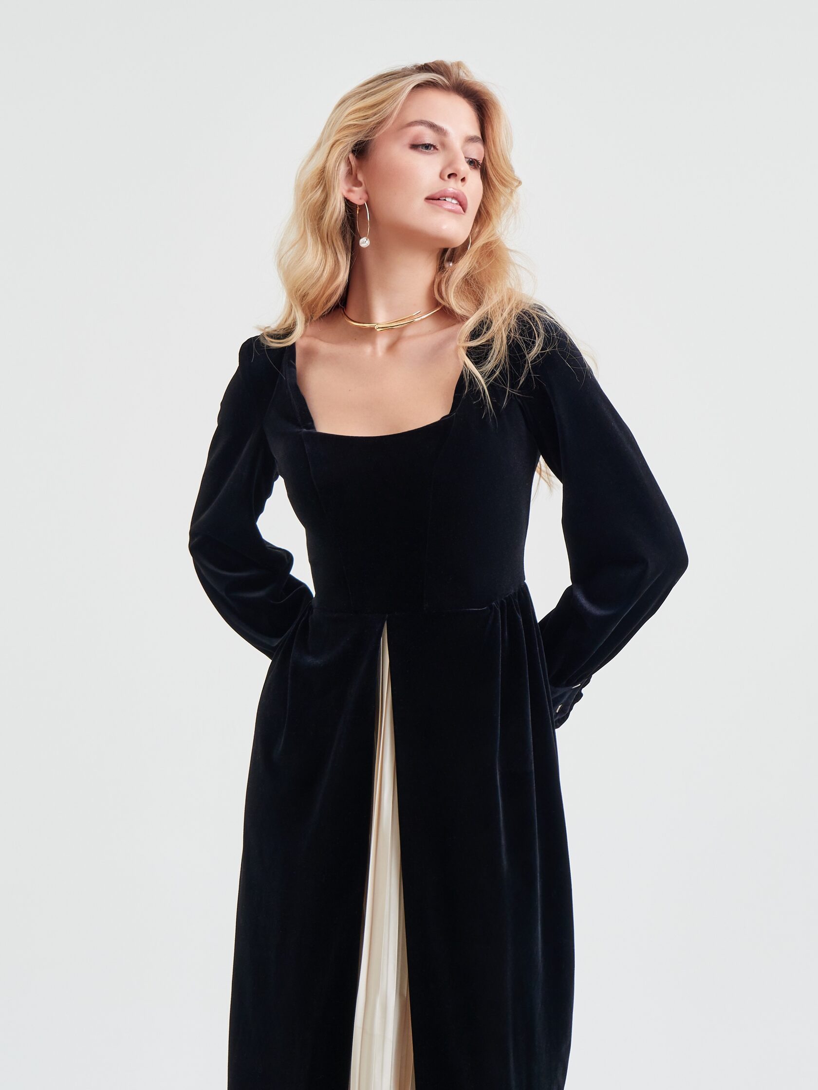Черный бархат задает тон всему образу. Он одновременно строгий и с легкой игривостью в виде деликатного блеска. Вставка плиссе из искусственного шелка цвета айвори оживает вместе с движениями обладательницы изделия.