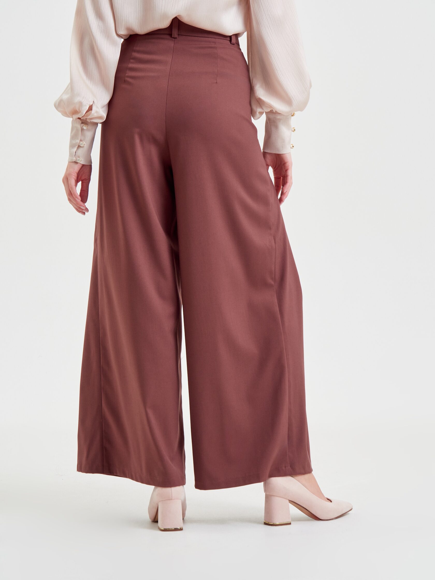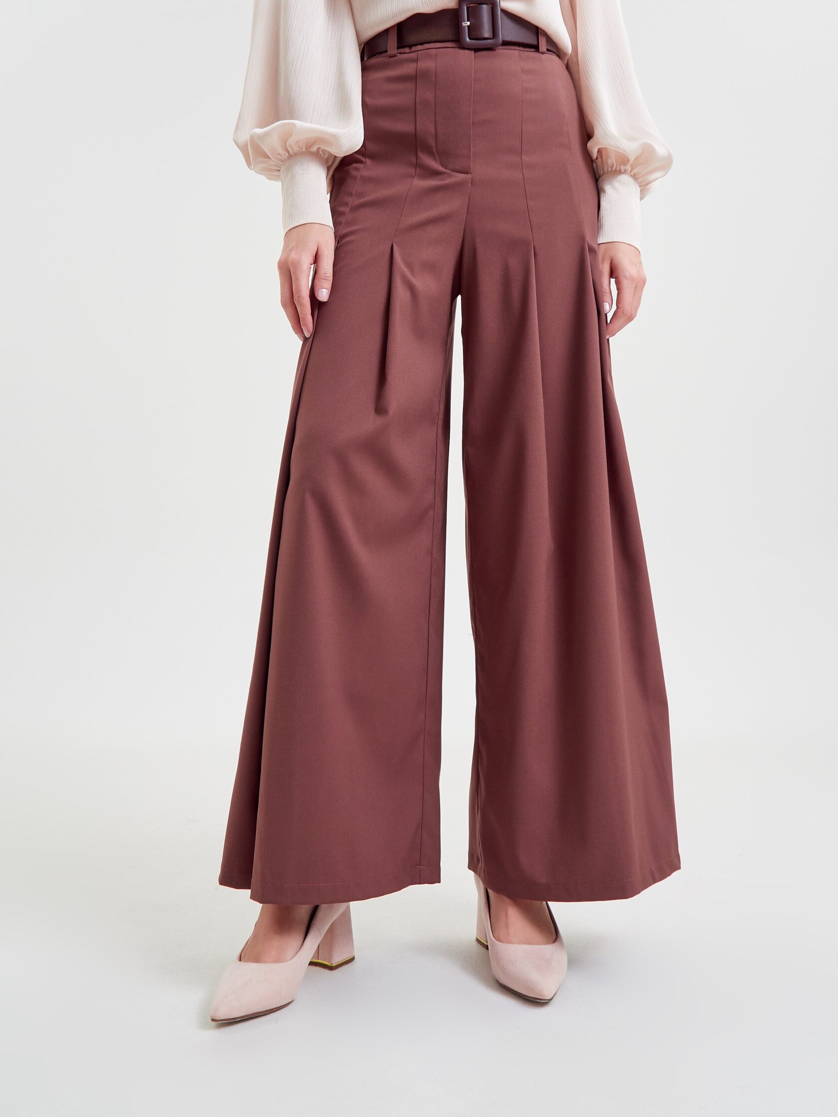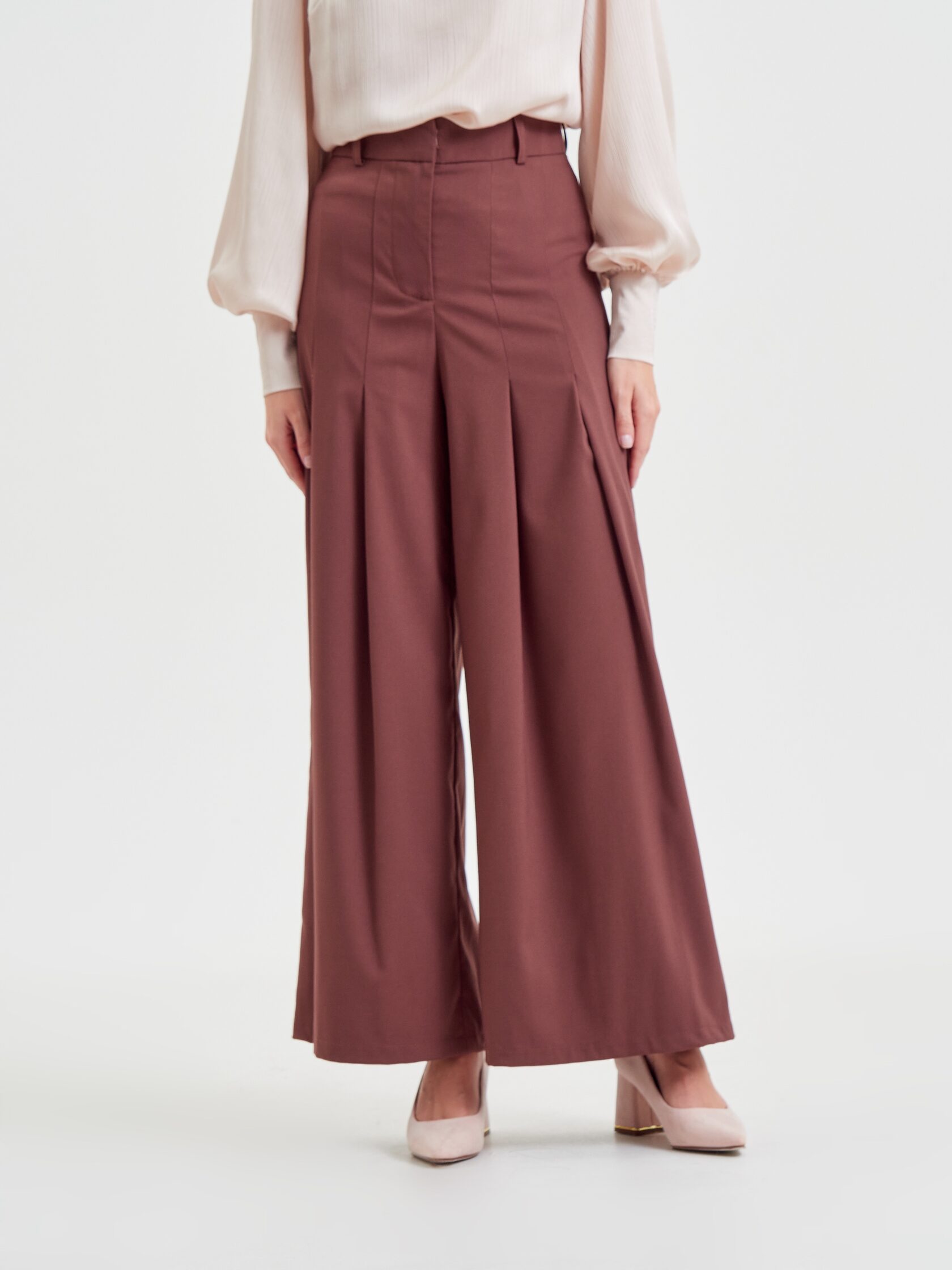 Брюки «Мнение» дополняют образ — широкие, на высокой посадке, с четырьмя складками спереди и длиной «в пол».