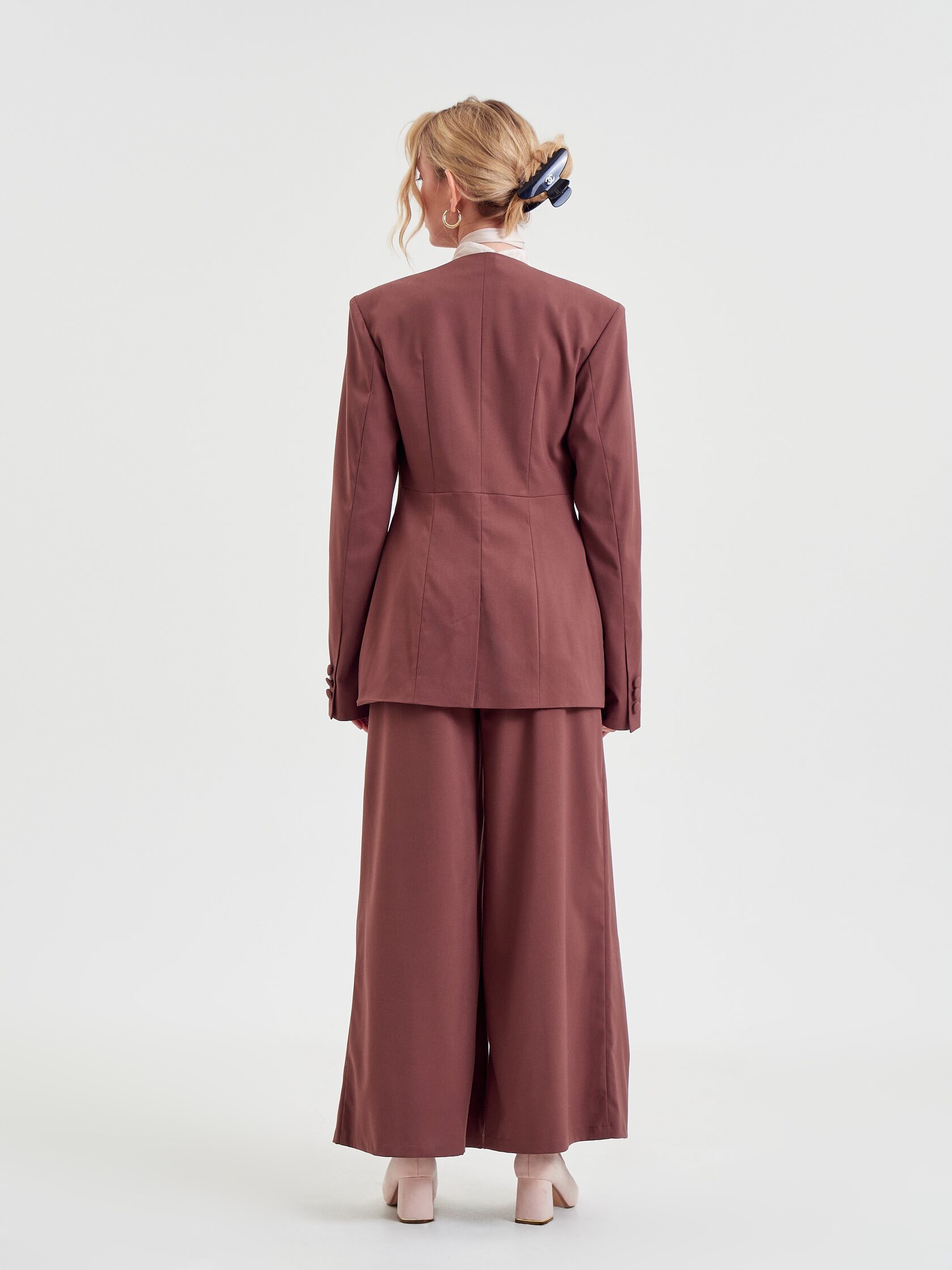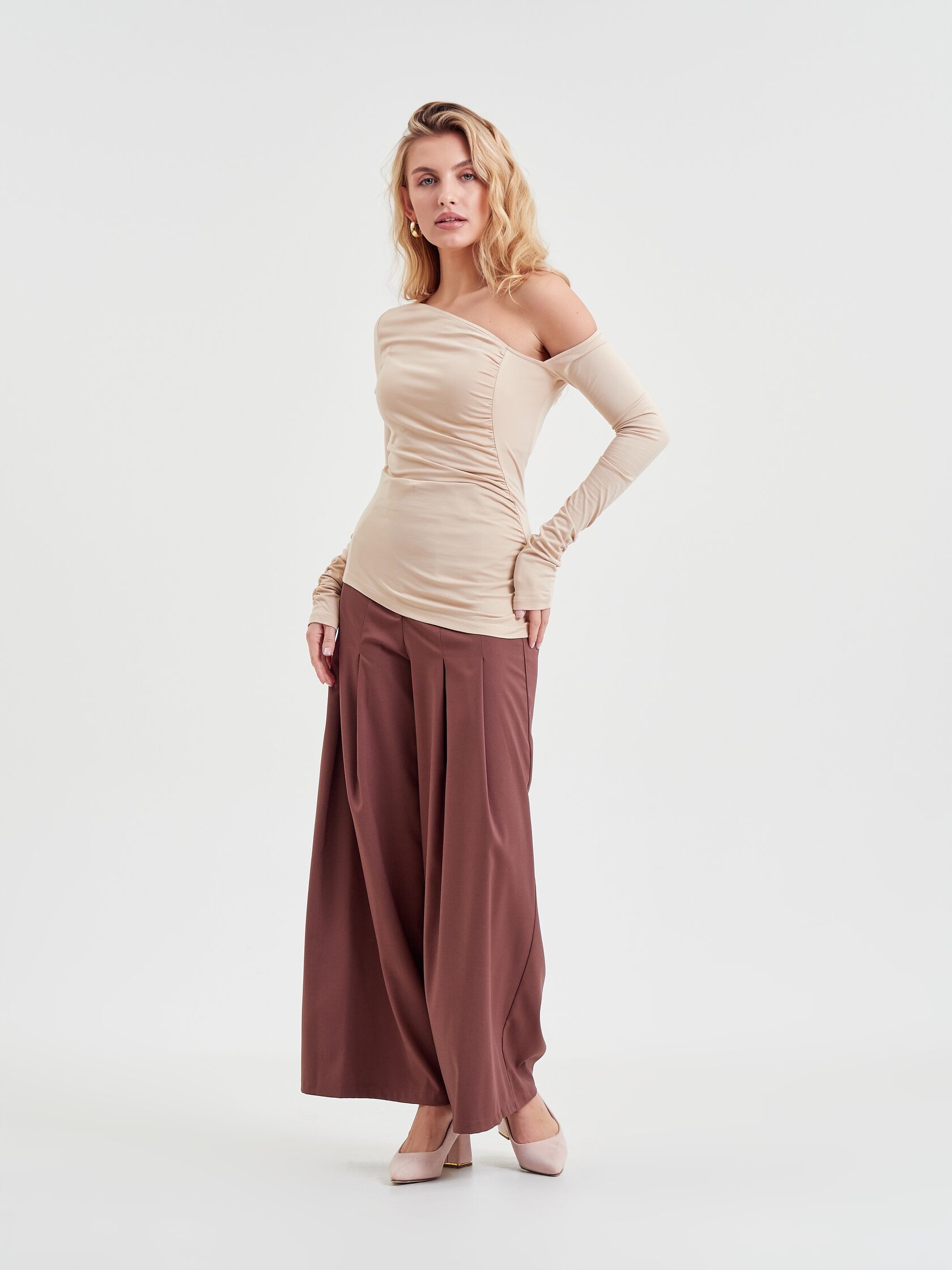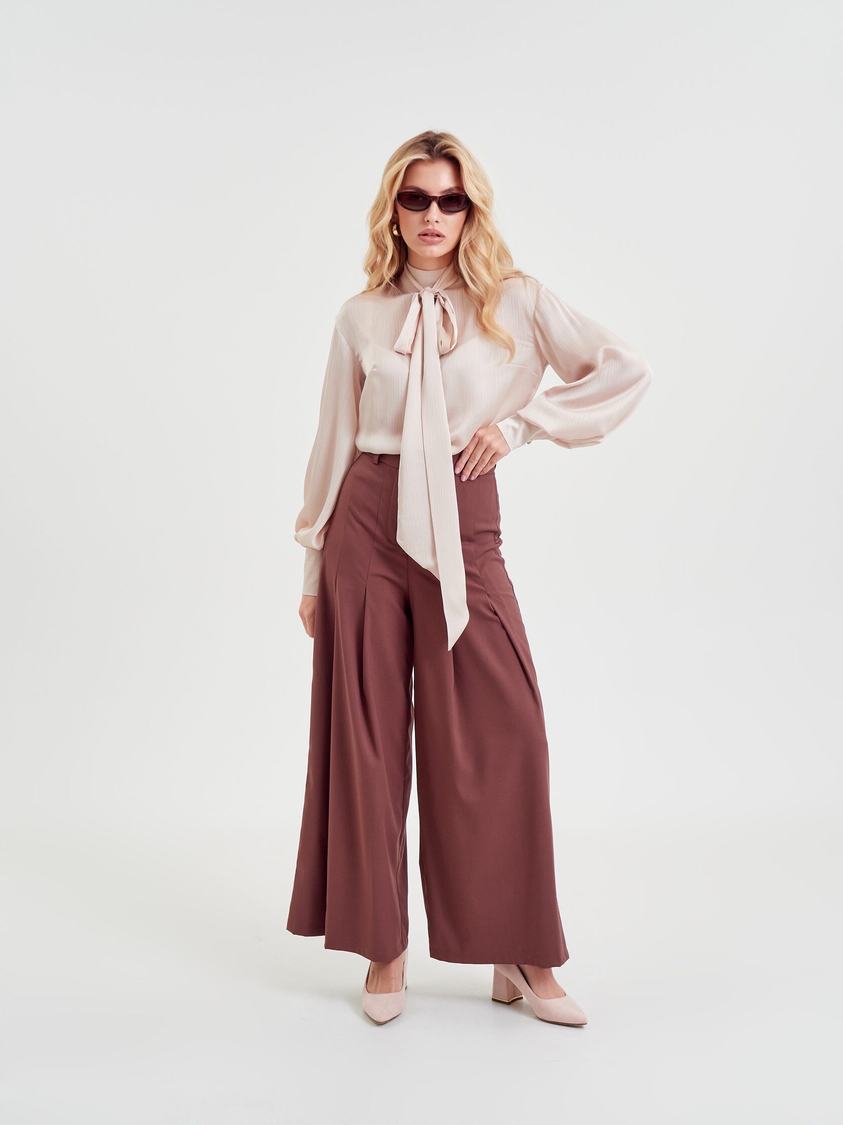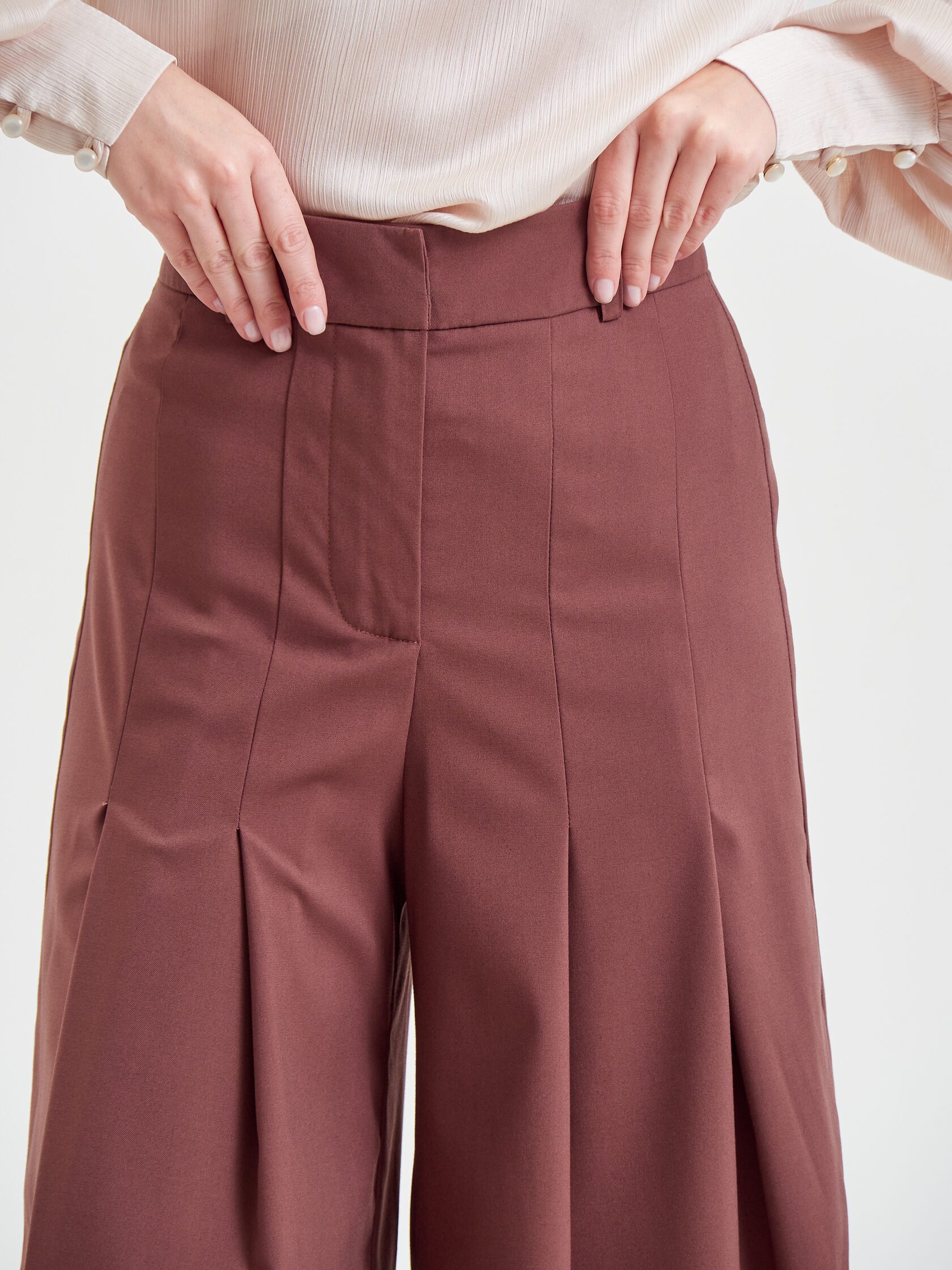 Брюки «Мнение» дополняют образ — широкие, на высокой посадке, с четырьмя складками спереди и длиной «в пол».
