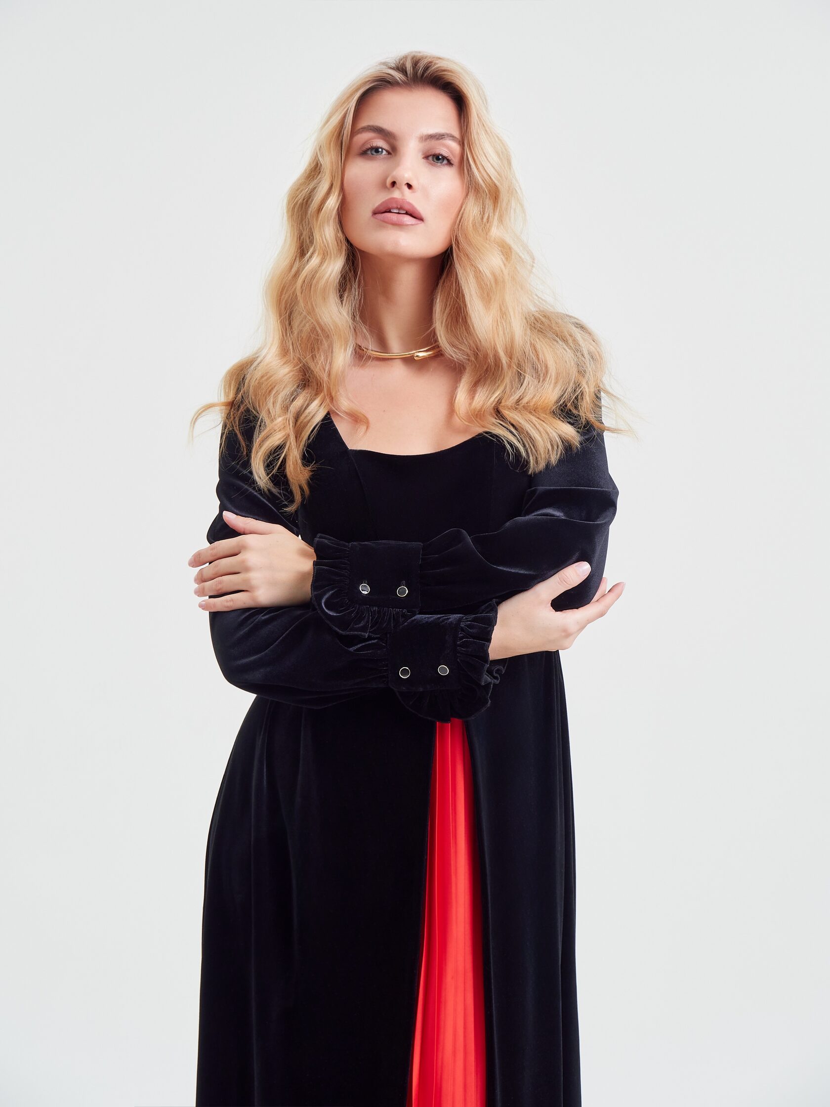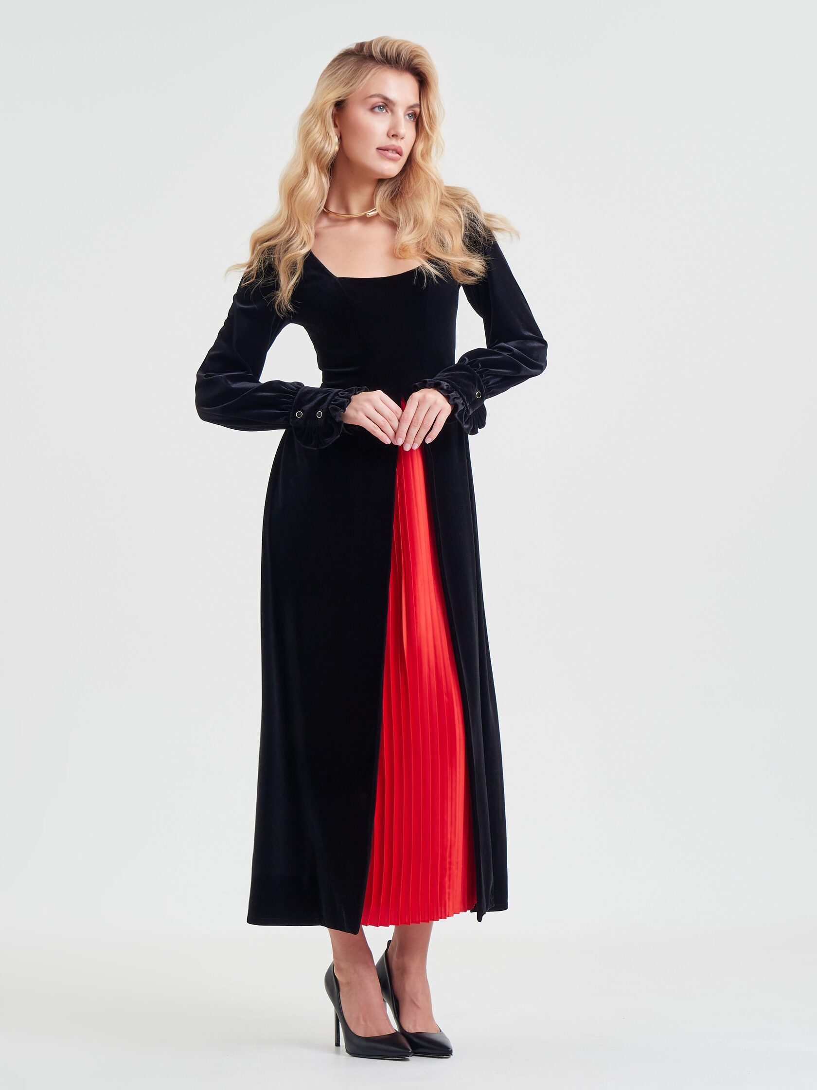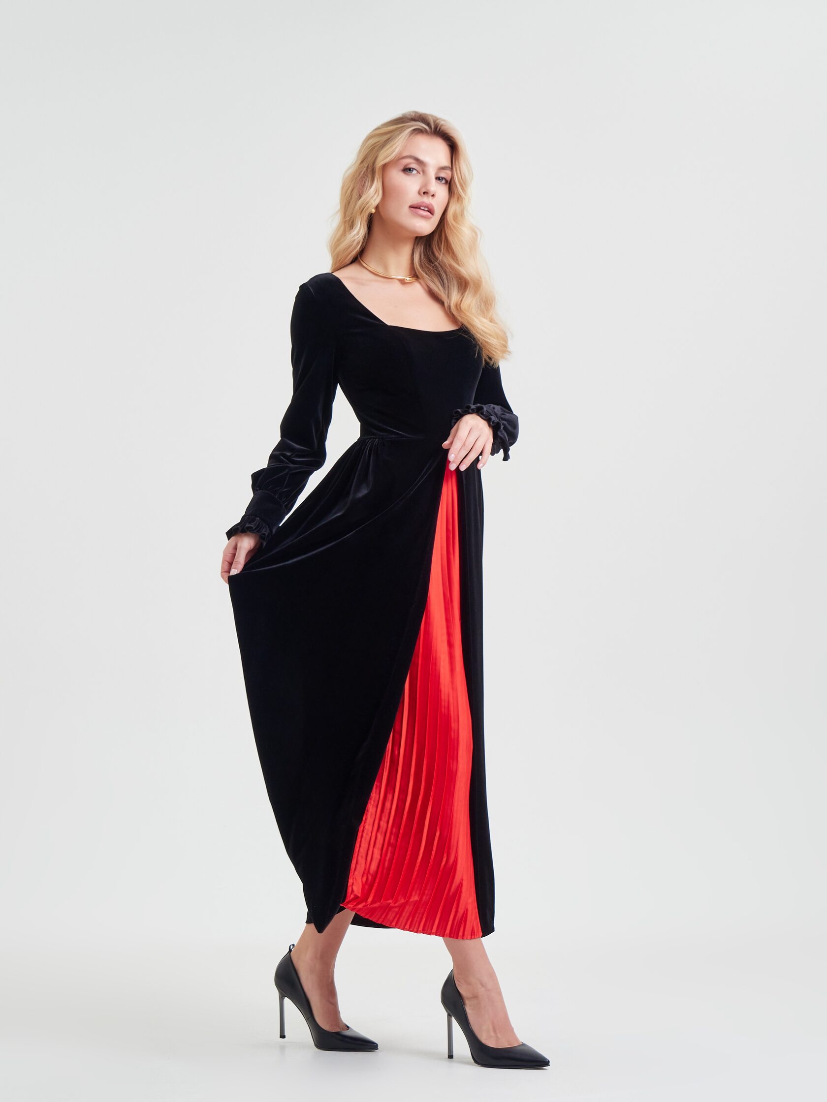 Платье «Муза» играет на контрастах: черный бархат встречает плиссе красного цвета и создает баланс, который ищет каждая. Строгость и одновременно дерзость делают образ неповторимым.