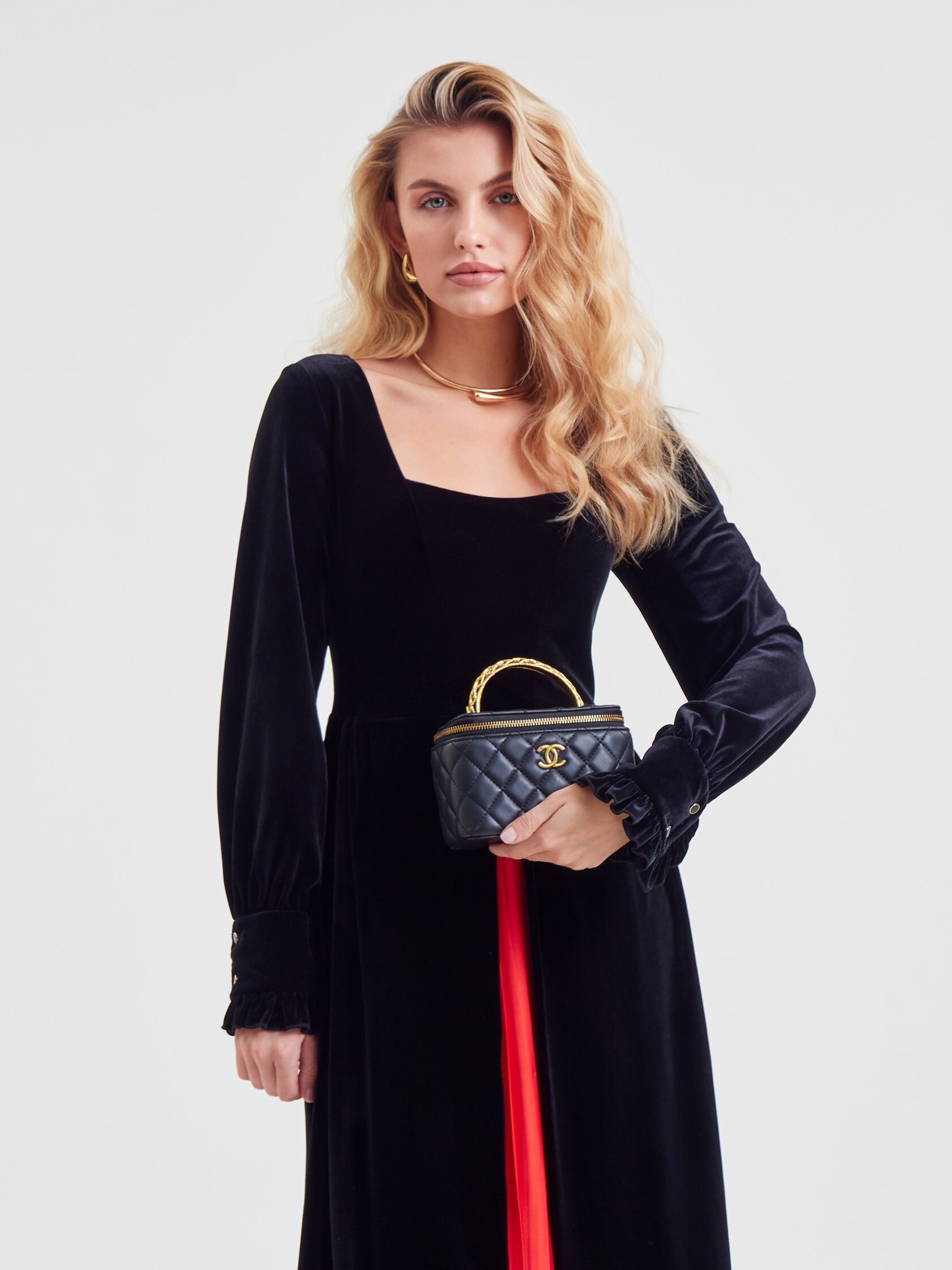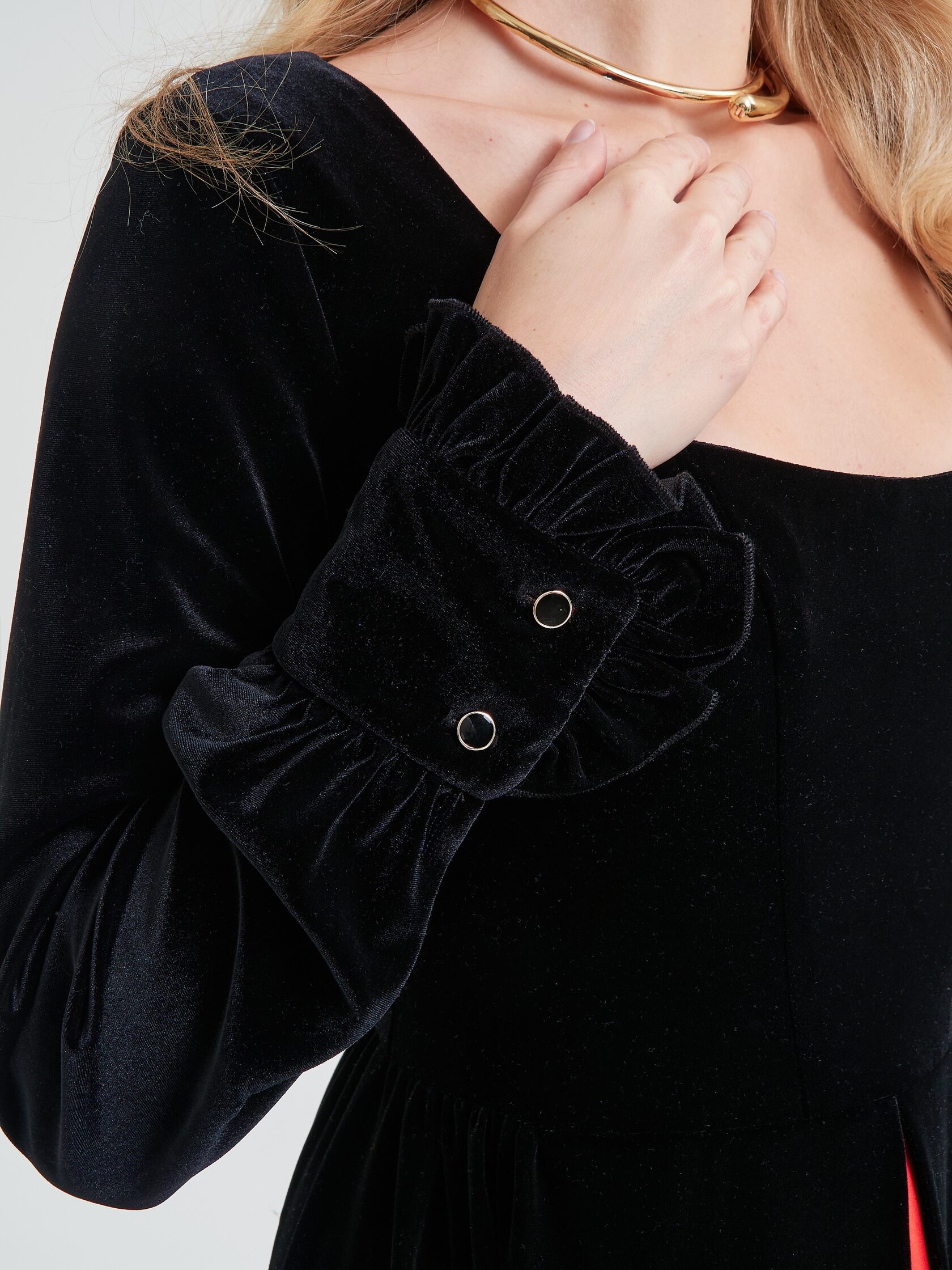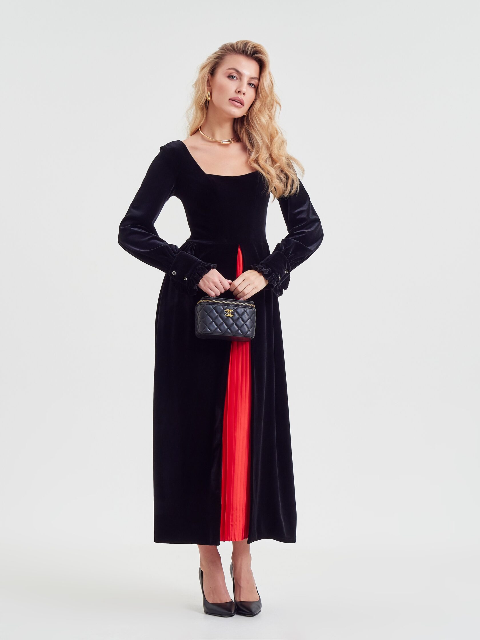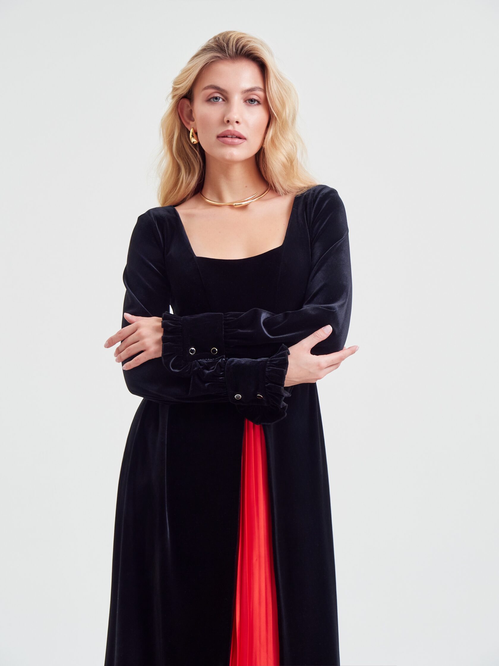 Платье «Муза» играет на контрастах: черный бархат встречает плиссе красного цвета и создает баланс, который ищет каждая. Строгость и одновременно дерзость делают образ неповторимым.