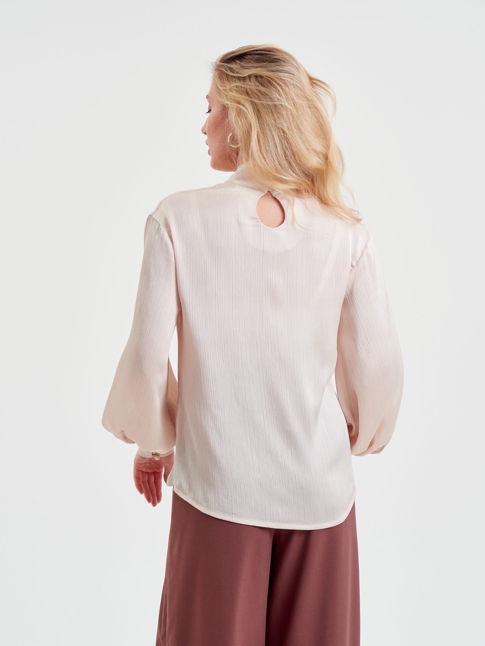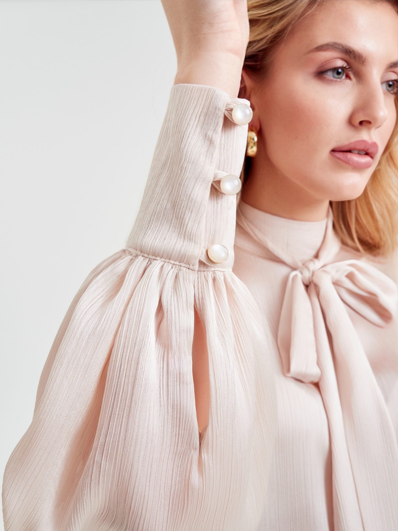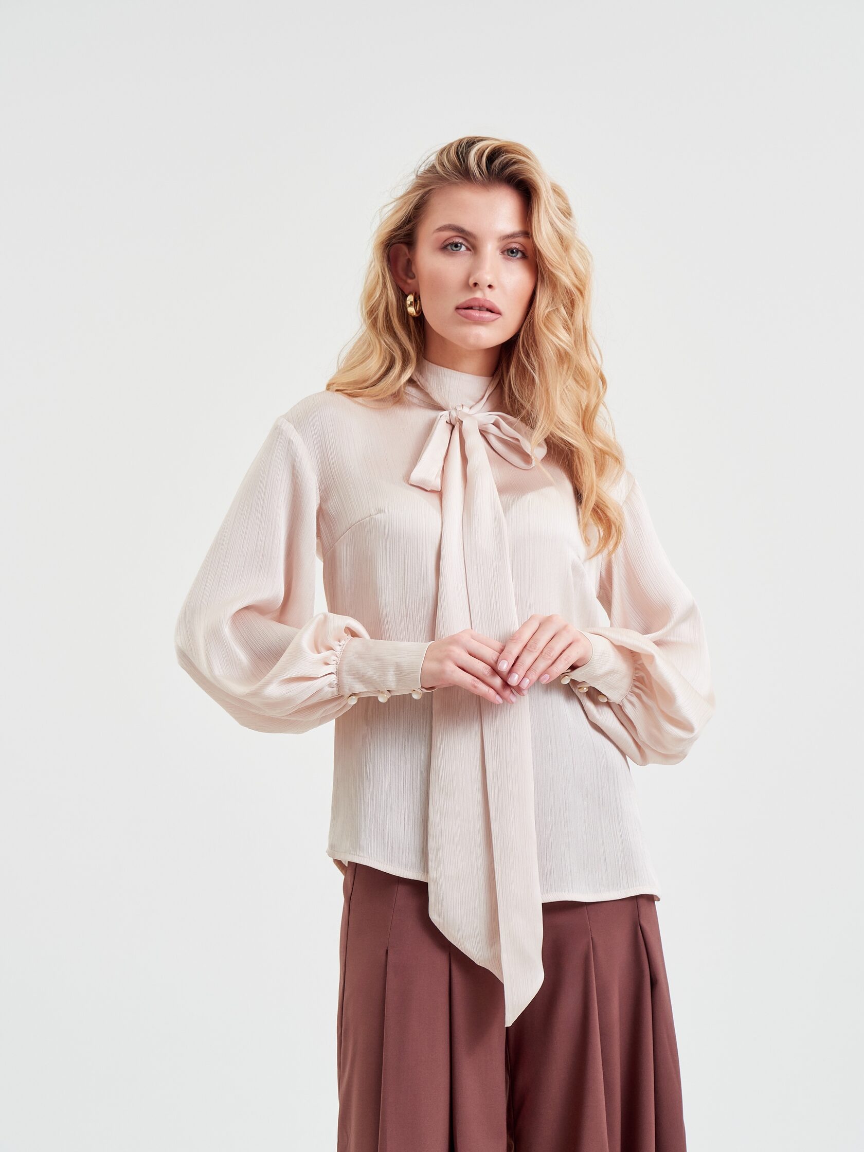 Невесомая, обволакивающая ткань будто обнимает обладательницу и дарит ей ощущение нежности. В этой блузе невозможно остаться незамеченной. Пышные рукава придают образу легкость и воздушность, а узкие манжеты на пуговицах притягивают внимание к запястьям, подчеркивая красоту каждого жеста.