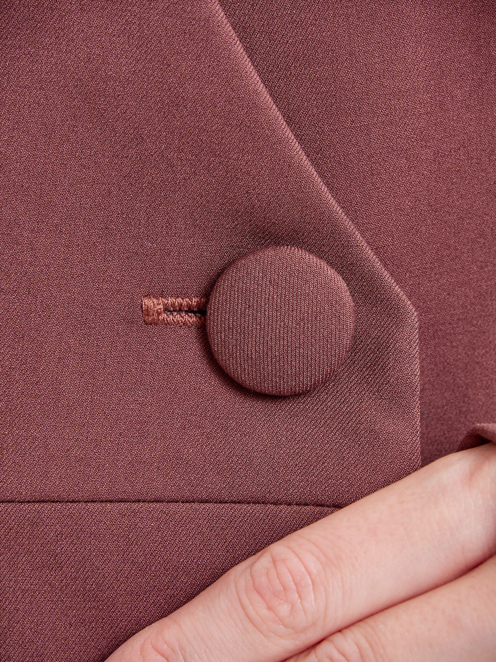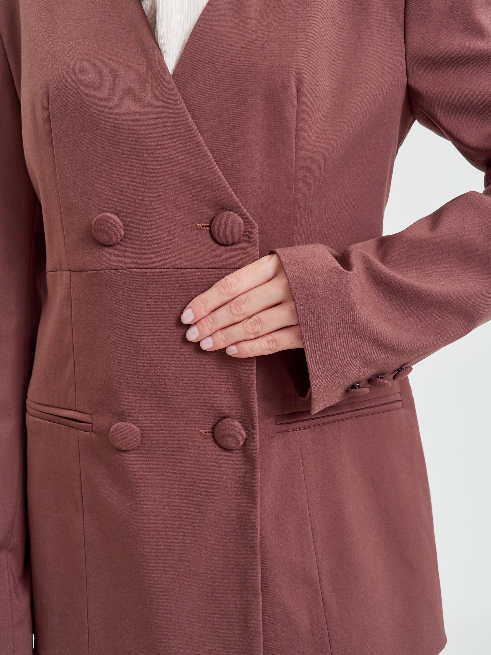 Жакет «Эксперт» выполнен в полуприлегающем силуэте в длине ниже линии бедер. Смещенная застежка на четыре пуговицы и отсутствие воротника делают жакет современным и утонченным, а карманы с клапанами добавляют функциональности и удобства при ношении.